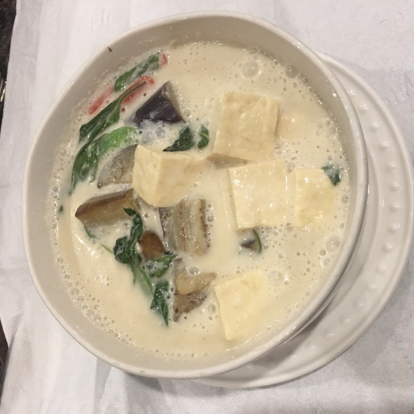 Green curry paste with coconut milk, basil, bell pepper, and egg plant.