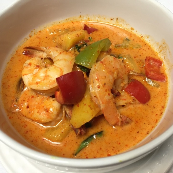 Shrimp, pineapple chunk, basil, bell pepper in coconut milk and home style red curry.
