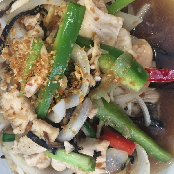 Stir fried fresh ginger, onion, mushroom, bell pepper, and scallion.