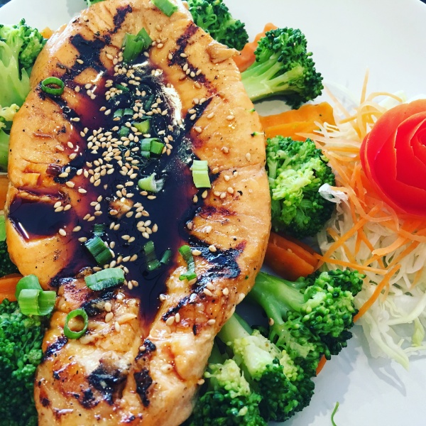 Grilled salmon with our teriyaki sauce, served with steamed broccoli and carrot.