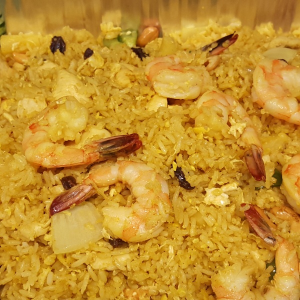 Fried rice with chicken, shrimp, pineapple, egg, onion, bell pepper, raisin, and cashew nut.