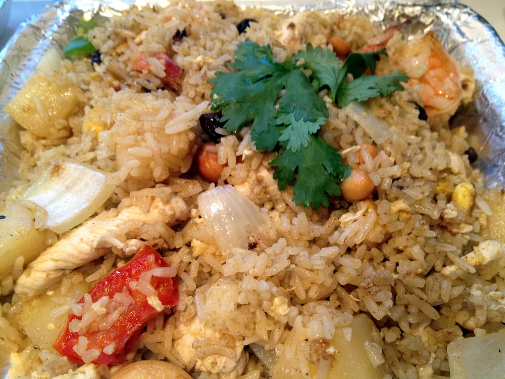 Fried rice with scallop, shrimp, fish, squid, mussels, egg, onion, and shrimp paste.