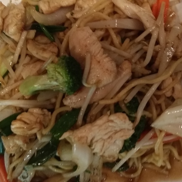 Stir fried egg noodle with cabbage, broccoli, onion, carrot, and bean sprout.