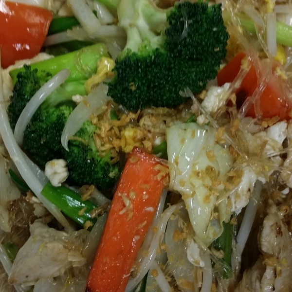 Stir fried glass noodle with egg, bean sprout, scallion, and peanut.