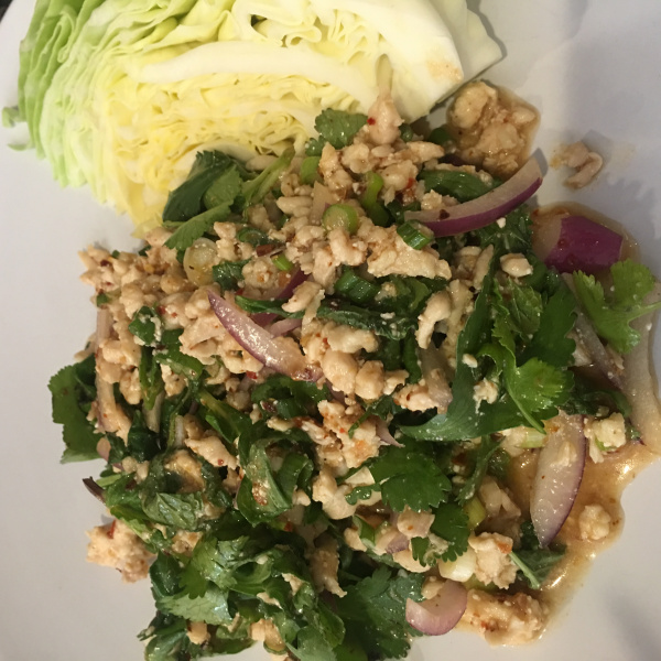 Ground chicken with red onion, rice powder, mint leaves, cilantro, and lime juice.