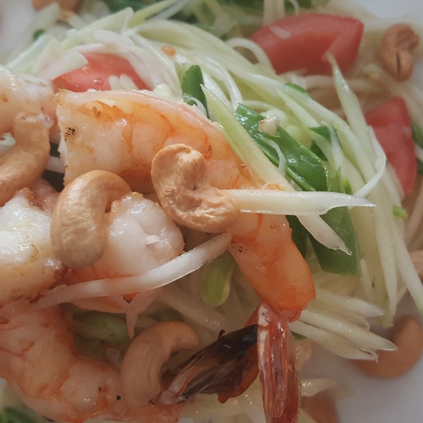 Shredded papaya, tomatoes, green beans, cashew nuts, garlic, chili, and lime juice served on crispy rice.