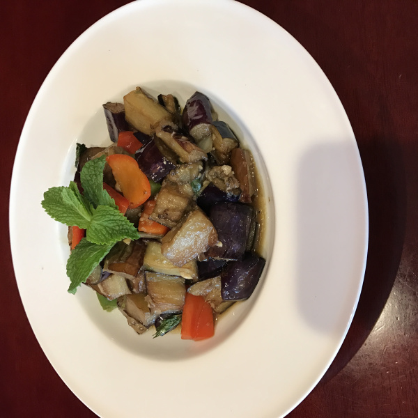 Sauteeed eggplant with garlic, chili, bell pepper, Thai basil, and onion.