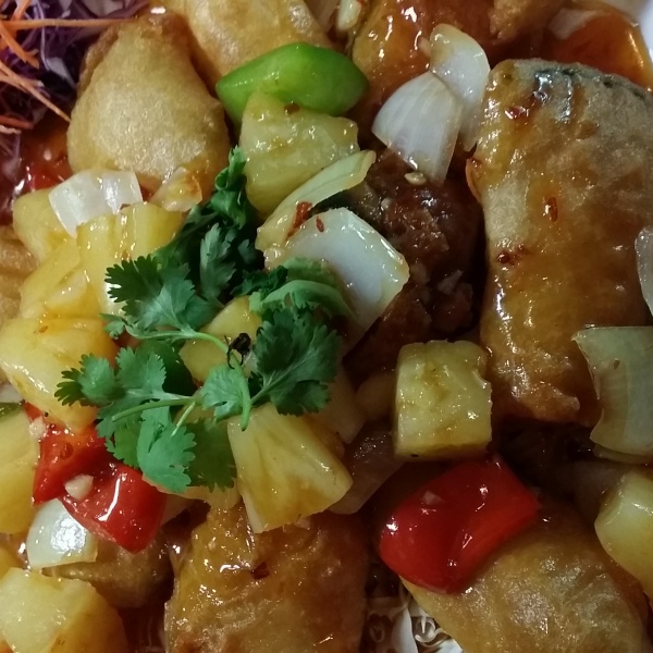 Soy fish stir friend in our sweet and sour sauce complemented with bell pepper, onion, pineapple, and shredded cabbage.