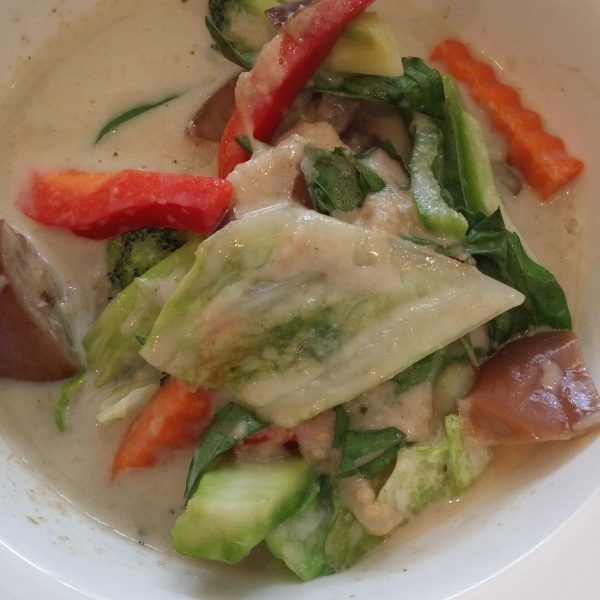 Green curry paste with coconut milk, basil, bell pepper, and egg plant.