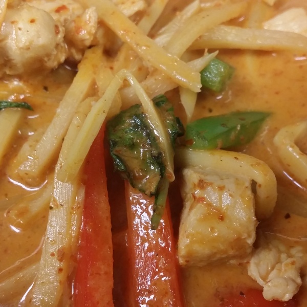 Red curry paste with coconut milk, basil, bell pepper, and bamboo shoots.